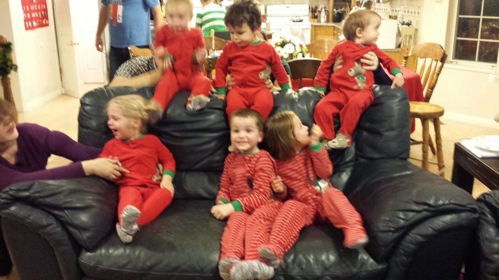 This is what happens when you try to take a picture of 6 cousins in their matching jammies from Grandma! I love these pictures so much. I can't stop laughing every time I look at them. I think that they turned out way better than a plain old nice smiling picture. Even though some of the kids are not very pleased to be forced to sit by their cousins. Ha!